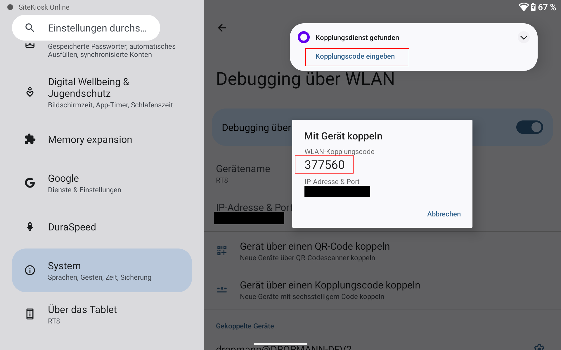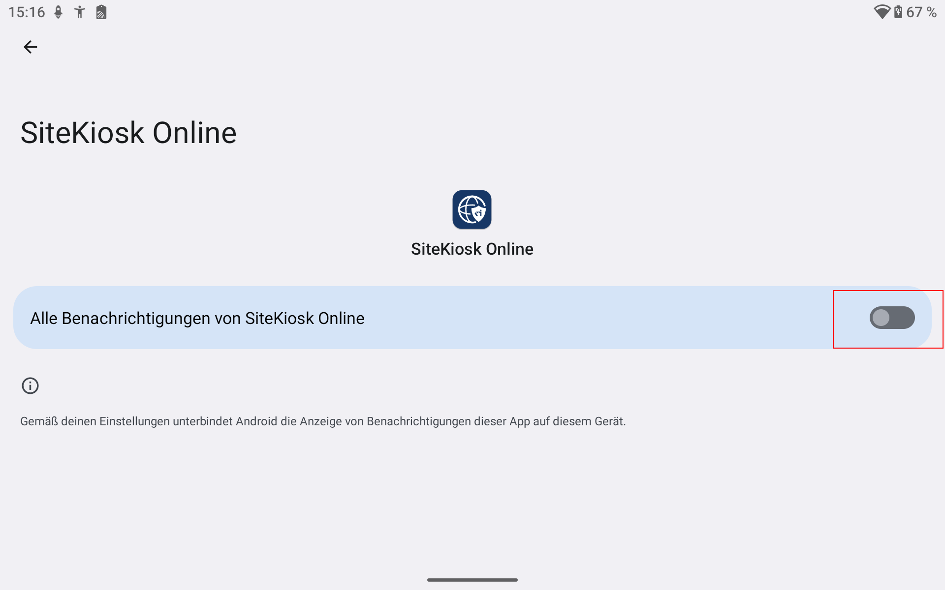 - Aktivieren Sie die Benachrichtigungsoption um eine Kopplung mit den Entwickleroptionen zu ermöglichen. Dies ist notwendig um SiteKiosk Online zu installieren.