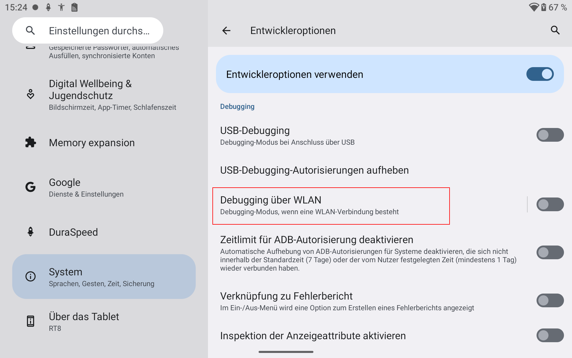 1. Öffnen Sie die Entwickleroptionen über den folgenden Button und aktivieren Sie die Entwickleroption "Debugging über WLAN"