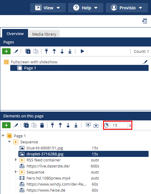 Eine Sequenz ist ein Container, mit dem Sie eingefügte Elemente zeitlich aufeinanderfolgend anzeigen können. Mit einer Sequenz können sie z.B. Bilder ähnlich wie in einer Slideshow präsentieren oder Videos wie in einer Playlist nacheinander abspielen. Es kann jedes Standardelement in eine Sequenz eingefügt werden. Dabei kann die Anzeigedauer für jedes eingefügte Element individuell eingestellt werden, außer für Videoelemente, bei denen die Dauer immer der des Videos entspricht. Die Anzeigedauer wird im Elementebaum eingestellt:
