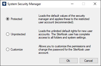 Während der Installation von SiteKiosk wird der SiteKiosk Benutzer standardmäßig bereits mit den Einstellungen für einen geschützten Betrieb konfiguriert. In den meisten Fällen sollte dies ausreichend sein und keinen weiteren Änderungen bedürfen. Sollten jedoch nachträglich Änderungen erforderlich sein, begrüßt Sie der SiteKiosk System Sicherheits-Assistent mit den folgenden Optionen, deren Änderungen nach dem Klick auf den OK-Button angewendet werden: