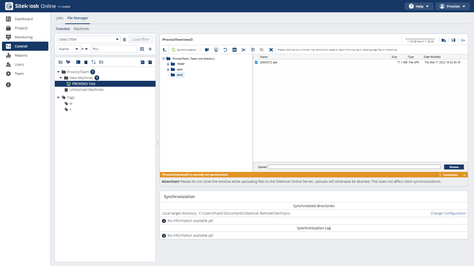 You can use the file manager to upload files to the server and then transfer them to individual clients or groups (synchronization). Synchronization can be performed automatically or only once. The tree view (left in the manager) gives you an overview of the folders created so far, the contents are displayed in the main view (right in the file manager).