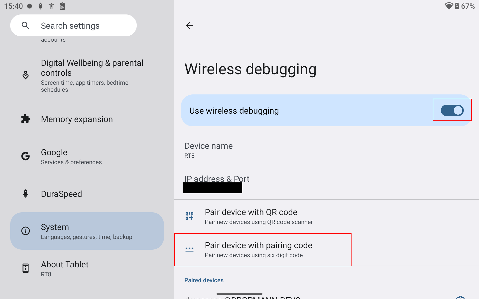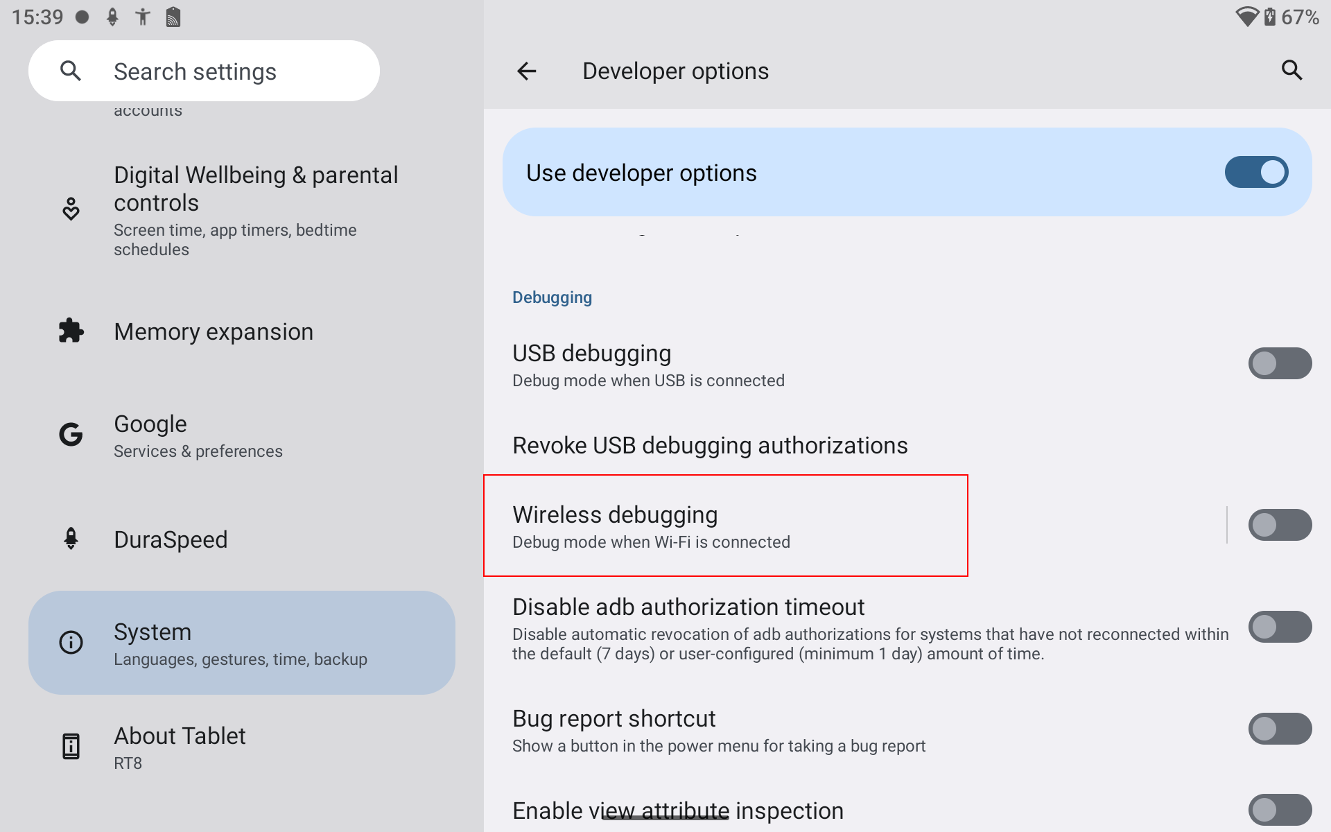 1. Open Developer options via the following button and enable the developer option "Wireless debugging"
